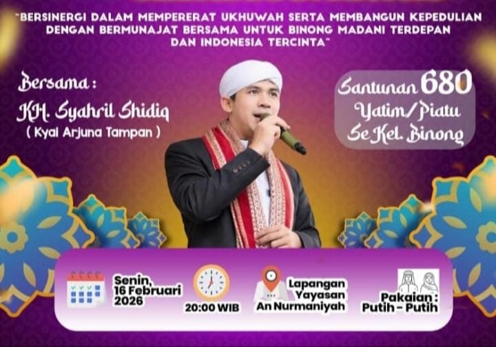 ExposeBanten.com | Tangerang — Kelurahan Binong menggelar Tarhib Ramadan 1447 Hijriah bersama KH Syahril Shidiq di Lapangan Yayasan An Nurmaniyah, yang akan diselenggarakan, pada Senin (16/2/2026) pukul 19.30 WIB. Kegiatan ini dirangkai dengan santunan kepada 680 anak yatim piatu se-Kelurahan Binong.