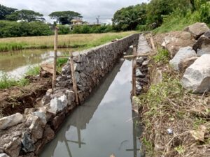 Lebih parah lagi, struktur irigasi terlihat dikerjakan dengan campuran batu baru dan batu bekas, susunan batu acak, tidak seragam, dan disatukan dengan adukan semen yang sangat minim.